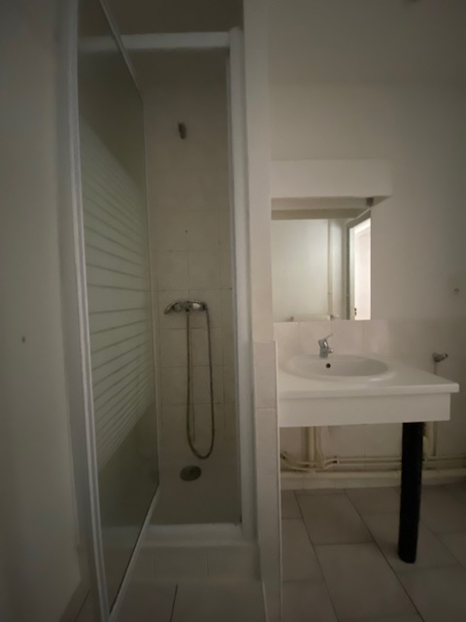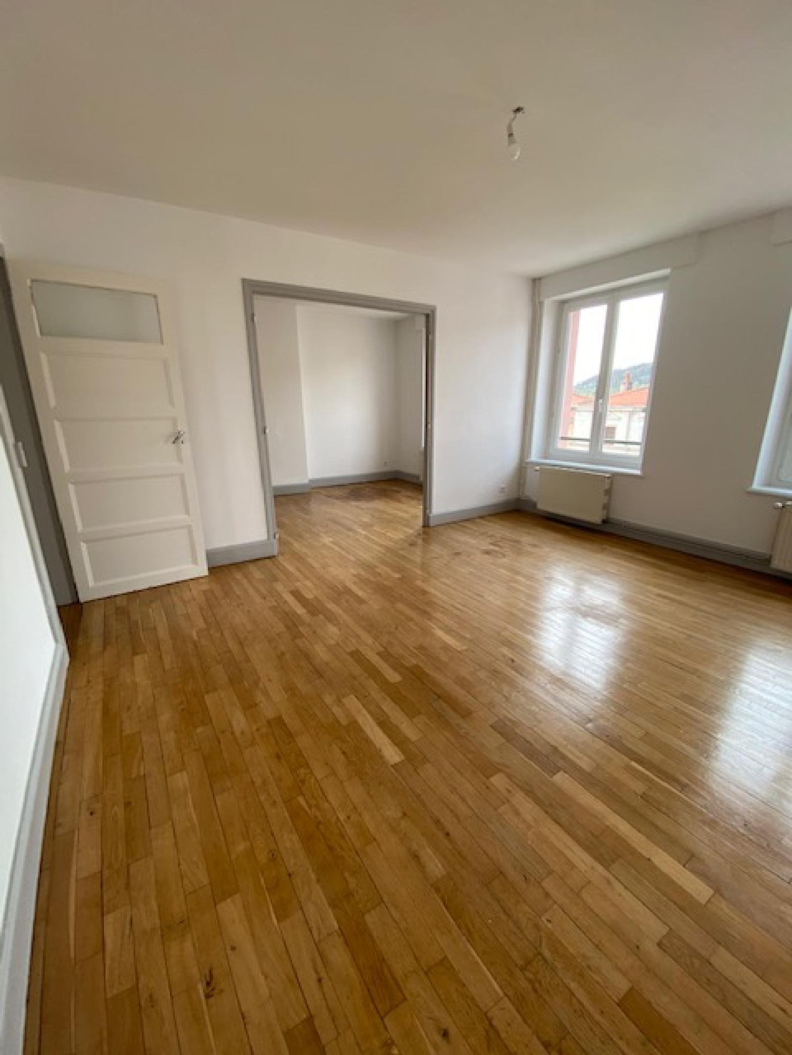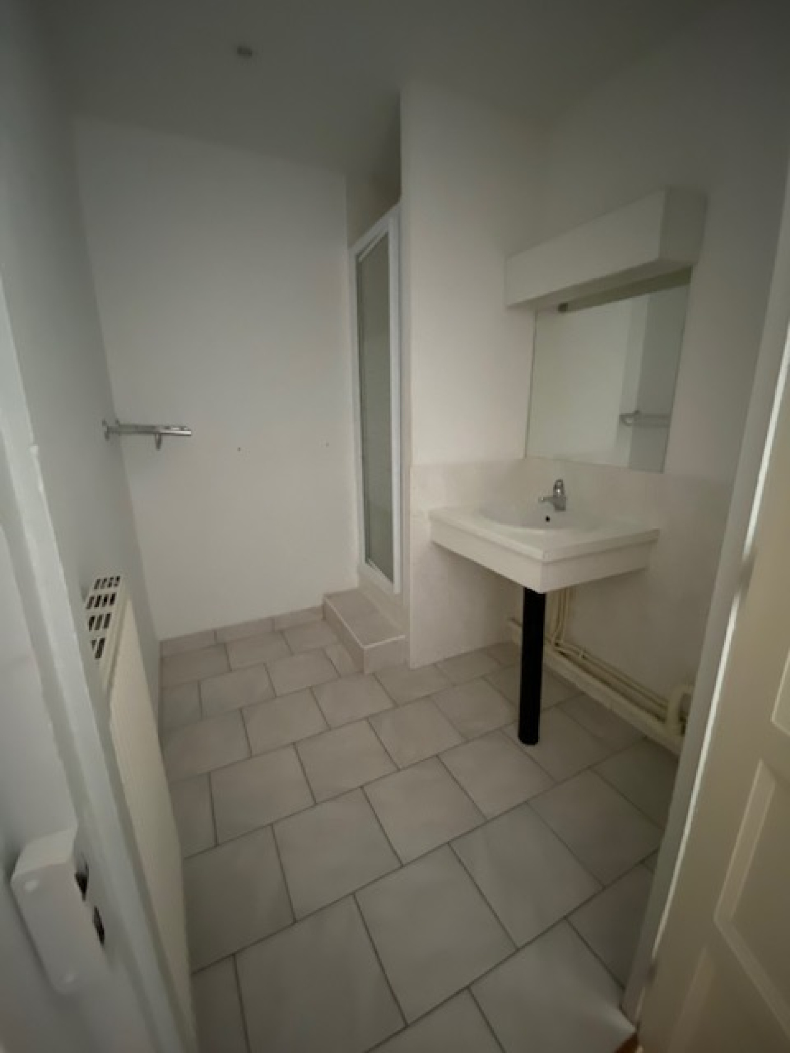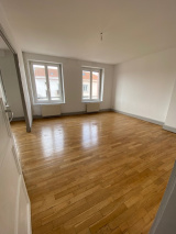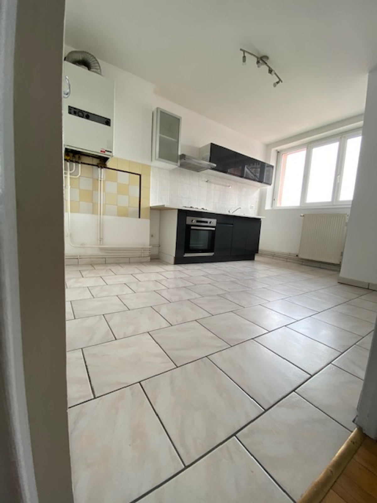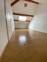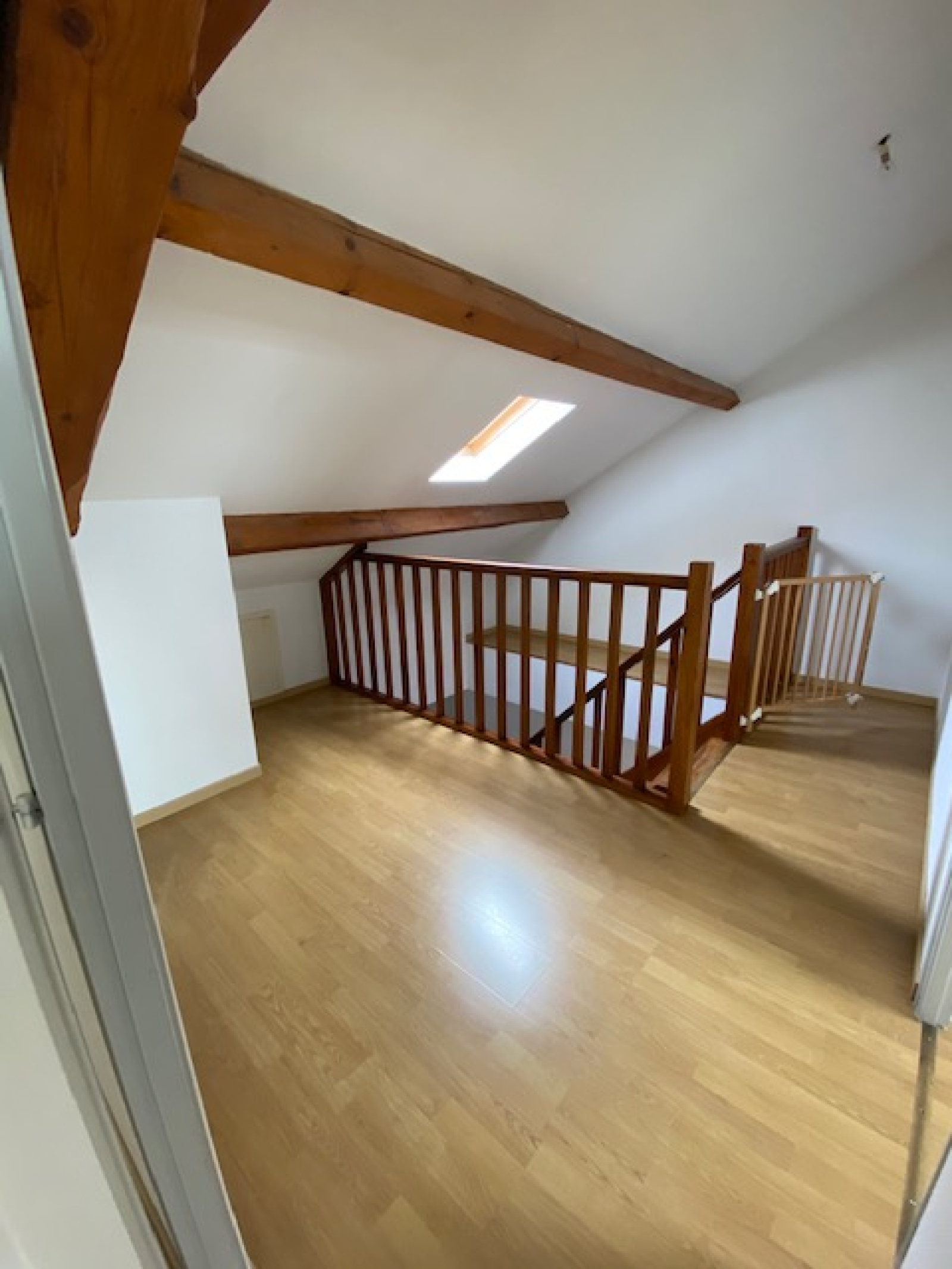 Au dernier étage d'un immeuble calme face à l'église, F4 comprenant : hall d'entrée, cuisine semi équipée (plaque de cuisson, hotte), séjour, salon, toilettes, salle d'eau. A l'étage, 2 chambres dont une très spacieuse. Chauffage central gaz. Disponible dès Avril 2026