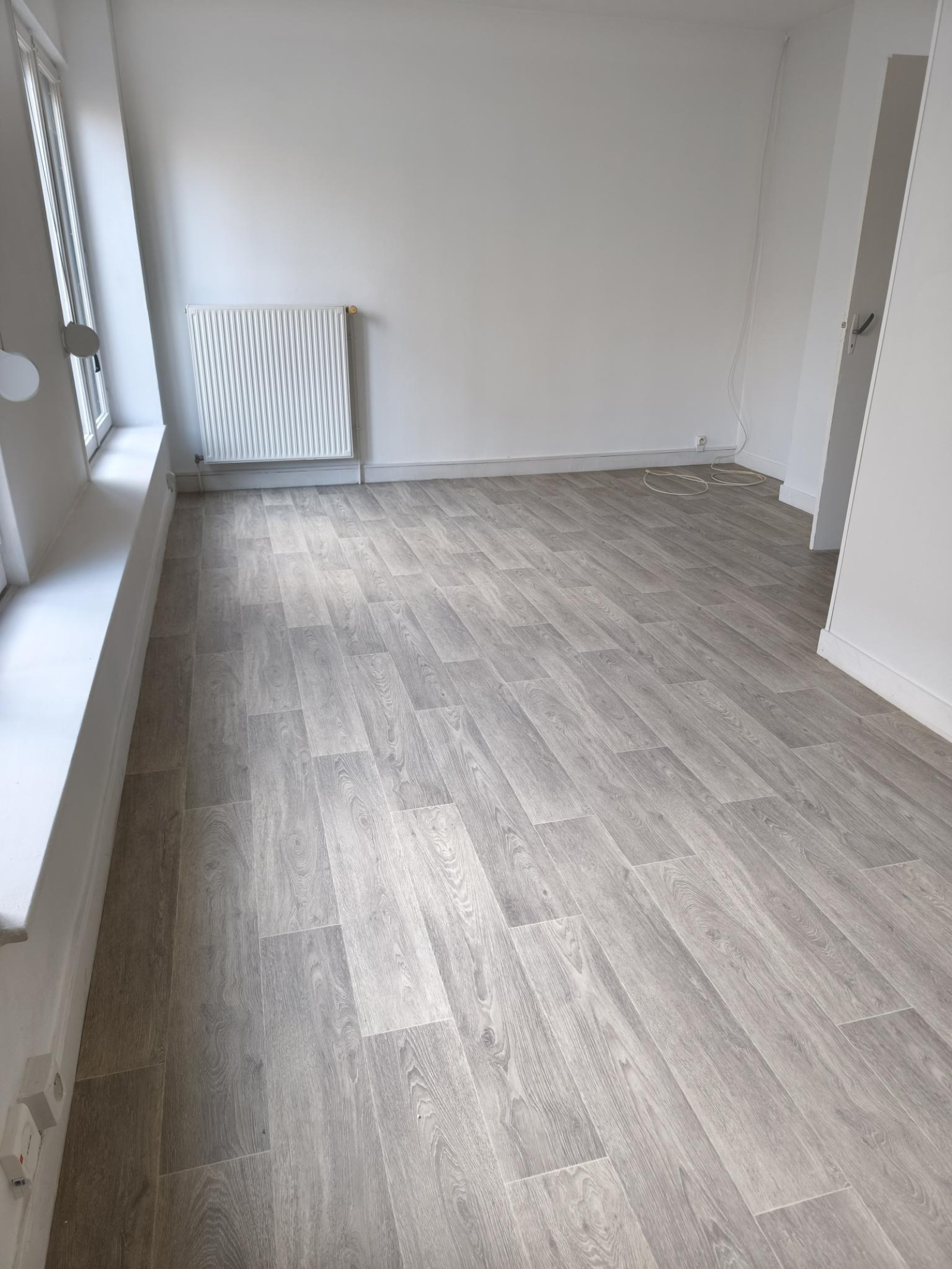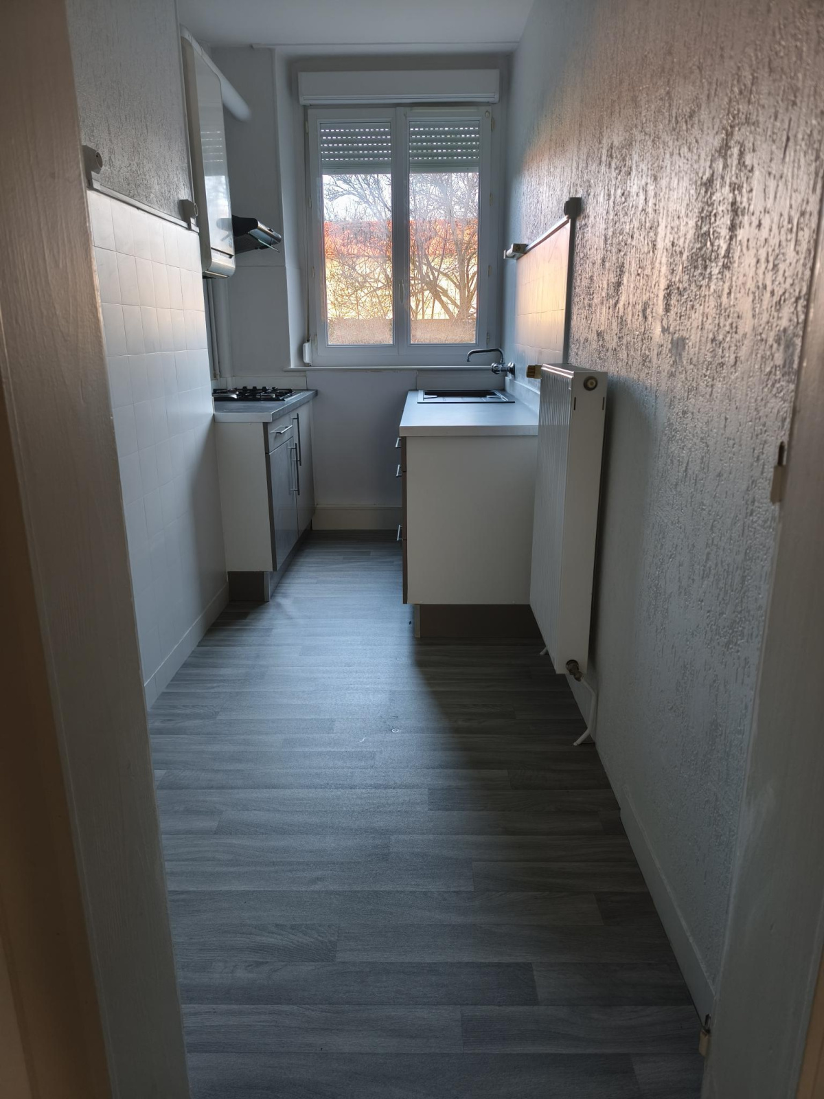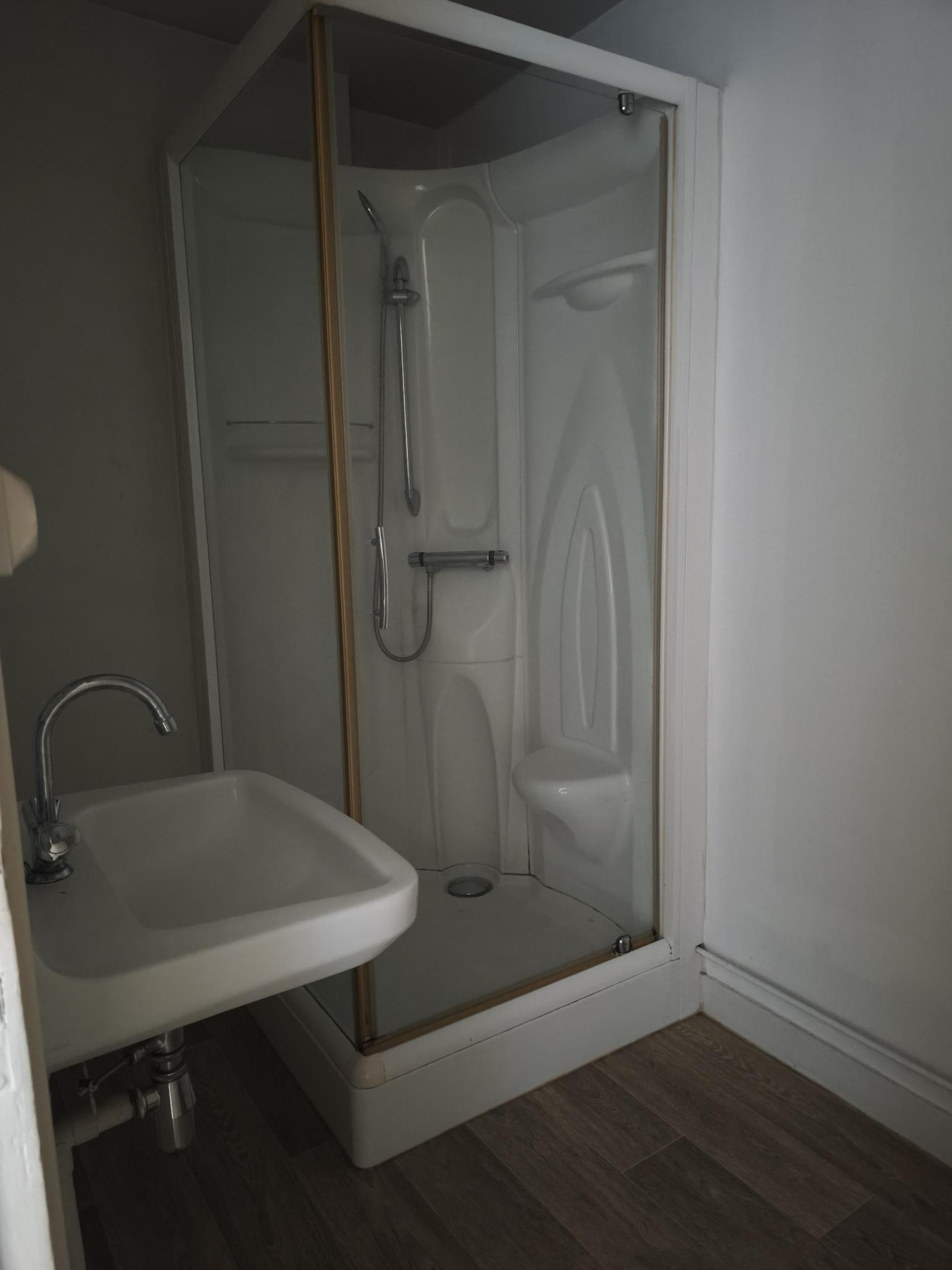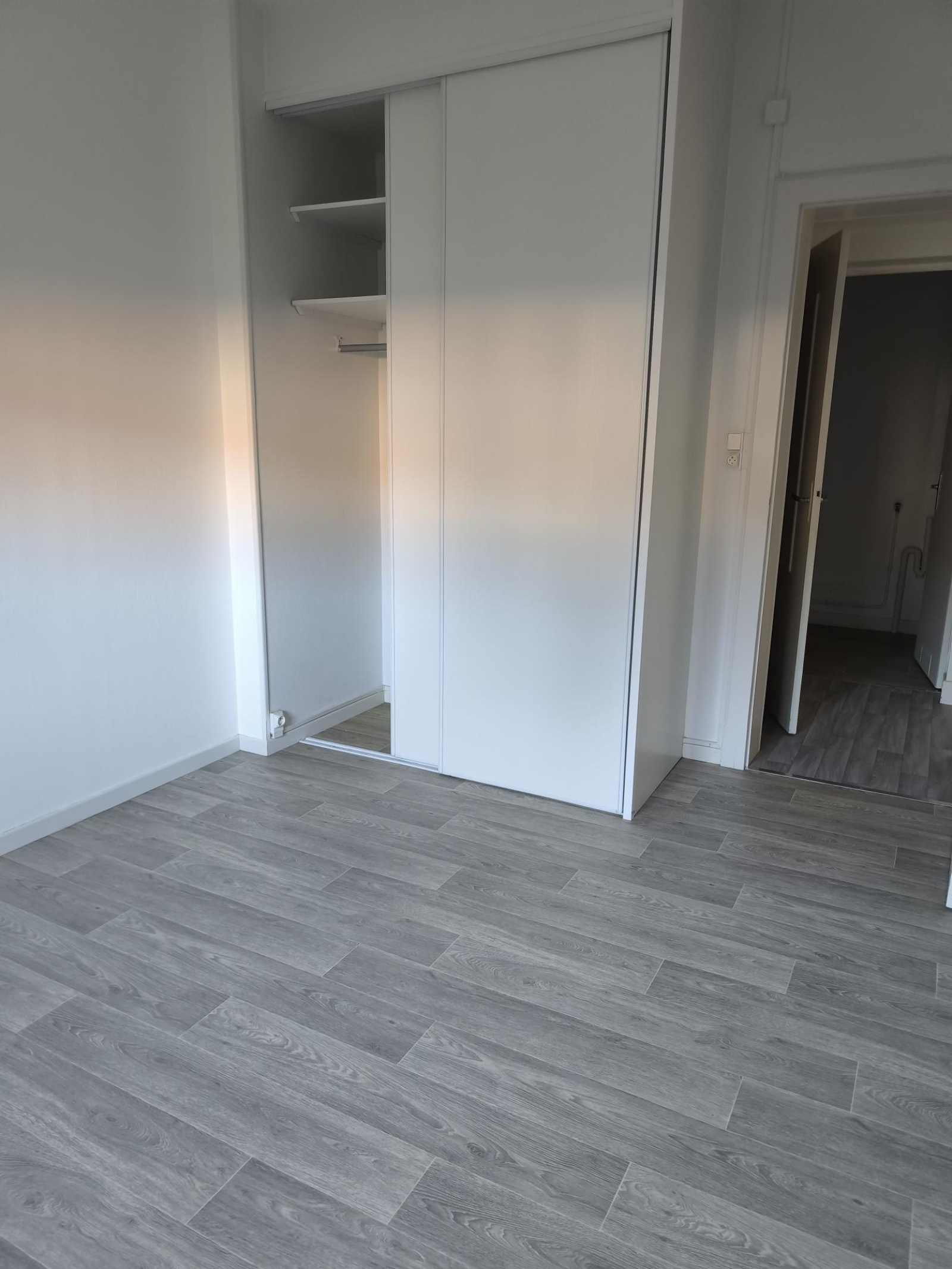 A quekques pas du centre, F2 en rdc comprenant : entrée, cuisine équipée (plaque de cuisson gaz, hotte, four), salon-séjour, une chambre avec placard, salle d'eau (douche), toilettes séparés. Jardin à l'arrière de l'immeuble. Chauffage central gaz.