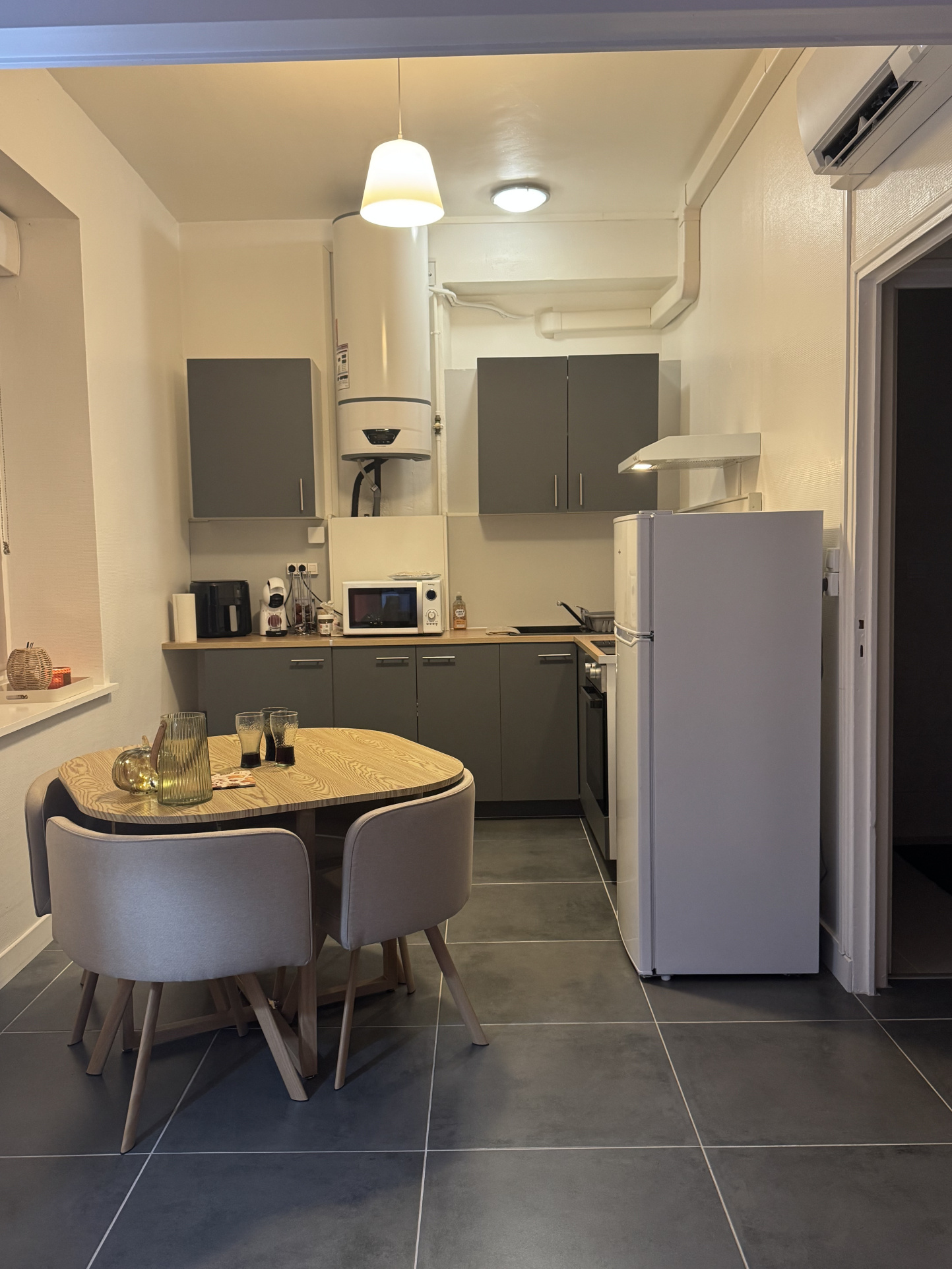 Dans petit immeuble de 4 appartements, F2 entièrement rénové en rez-de-chaussée avec cuisine équipée comprenant : entrée, cuisine ouverte sur séjour (mobilier, plaque de cuisson gaz, hotte et four), séjour, chambre, salle d'eau (douche), toilettes séparés. Chauffage par pompe à chaleur et chauffe-eau thermodynamique. Stationnement dans cour privée. Disponible aux alentours du 20/11/2025.