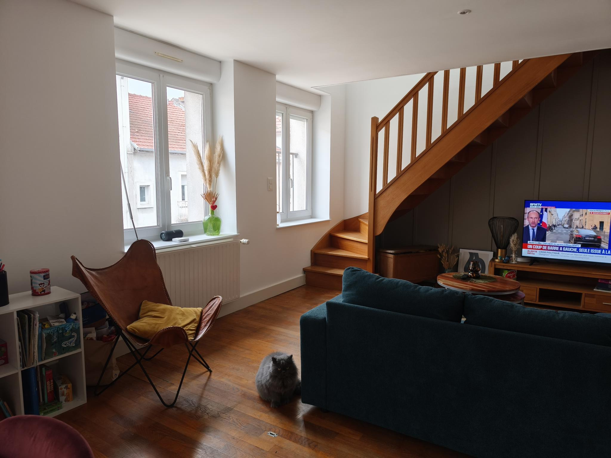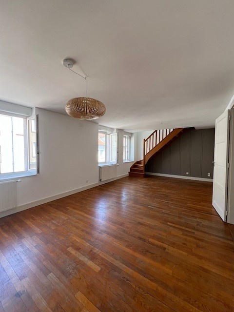 Centre - ville, aux pieds de tous les commerces, magnifique F4 duplex entièrement rénové et lumineux comprenant : hall d'entrée, cuisine meublée et équipée (plaque de cuisson, hotte, four, lave-vaisselle), salon et séjour, salle d'eau, toilettes séparés. A l'étage, mezzanine, 3 chambres (stores velux électriques). Cave commune. Une place de stationnement dans cour privative. Chauffage central gaz. Disponible dès Novembre 2025